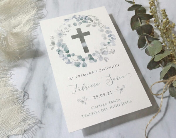 Tarjeta 8x13cm een papel perlado de 250g impresa full color con la cruz calada. Se puede personalizar el diseño. El mínimo es por 12 unidades.